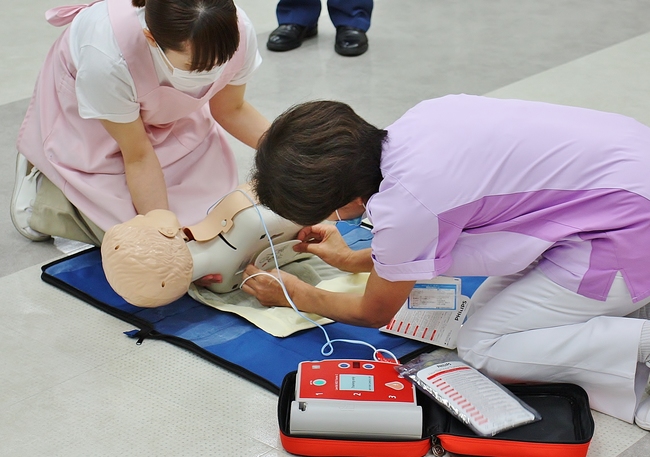 9月11日(金)、「みゆき会病院保育園」と「かみのやま病児保育室ぽかぽか」の職員を対象に、応急手当講習を行いました。当日は、講師として上山市消防本部より2名の署員の方にお越しいただき、応急手当の目的や重要性、また乳幼児などを対象としたAED(自動体外式除細動器)の使い方や心臓マッサージなど、実技を交えて詳しくご指導いただきました。職員からは、「知識だけではなく、一つひとつ具体的な動作を身体で覚えることができた」という声が聞かれました。